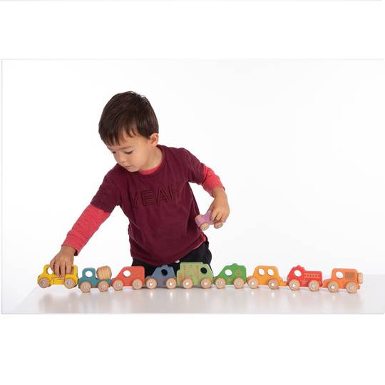 Vehicles de fusta de faig massissa de colors, cadascun amb quatre rodes giratòries, eixos metàl·lics i marques làser. El làser crea una lleugera imitació a la fusta, fent que les peces siguin tàctils per proporcionar un aspecte de descoberta sensorial.