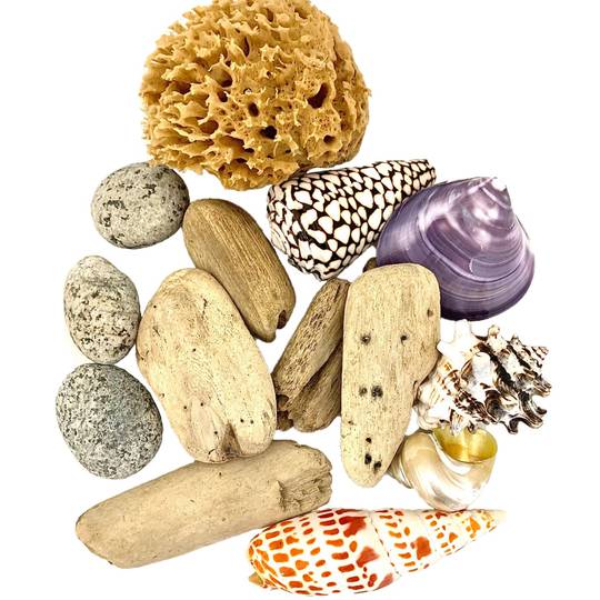 Un conjunt mixt de llaminadures que podeu trobar a una platja; petxines, roques, fusta flotant, potser fins i tot una esponja. Per descomptat, com que tots aquests elements són naturals, hi haurà variacions de mida i color i podem substituir les closques si cal.