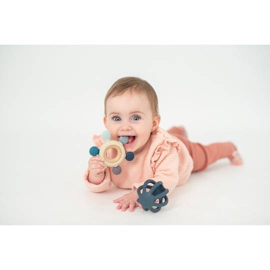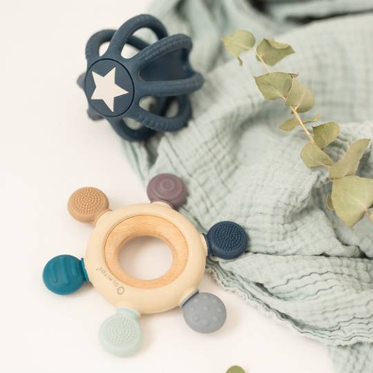 - l'altra combina una anella de fusta amb les puntes de silicona de diferents textures per a estimular a nivell sensitiu i calmar en el procés de dentició.