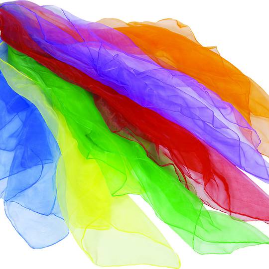 Conjunt de 6 teles de colors que permeten un ampli ventall de joc per als infants: joc sombòlic, disfresses, arrossegar objectes...