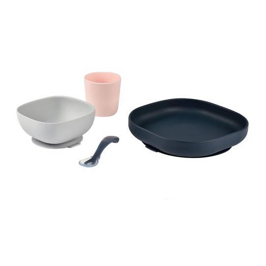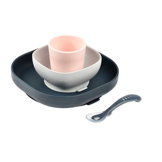Vaixella de silicona, composta de plat, bol, got i cullera. Els plats porten ventosa perquè quedin enganxats a la taula o trona. Apte per a microones i rentaplats.