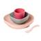 Vaixella de silicona, composta de plat, bol, got i cullera. Els plats porten ventosa perquè quedin enganxats a la taula o trona. Apte per a microones i rentaplats.